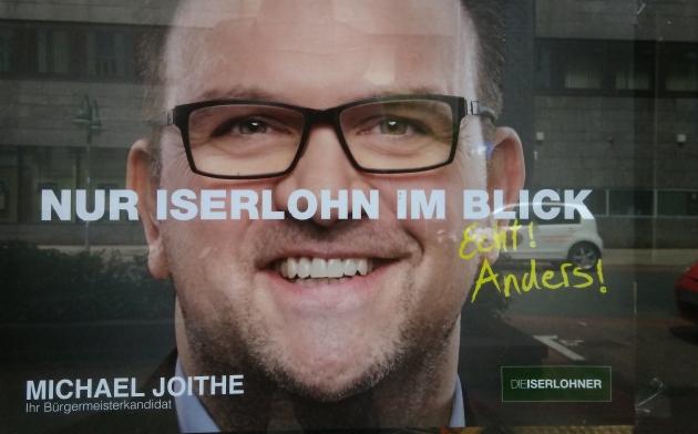 Nun ja, vor dem Hintergrund von #niemehrCDU, der unwählbaren SPD und der bekloppten afd wär' es fast eine gute Idee, den Herrn Joithe von den "die Iserlohner"n (wie soll man das wieder schreiben?) zum Bürgermeister zu wählen, wenn sich dieser Verein nicht mit so einem absurd blöden Wahlplakat selbst disqualifizieren würde: